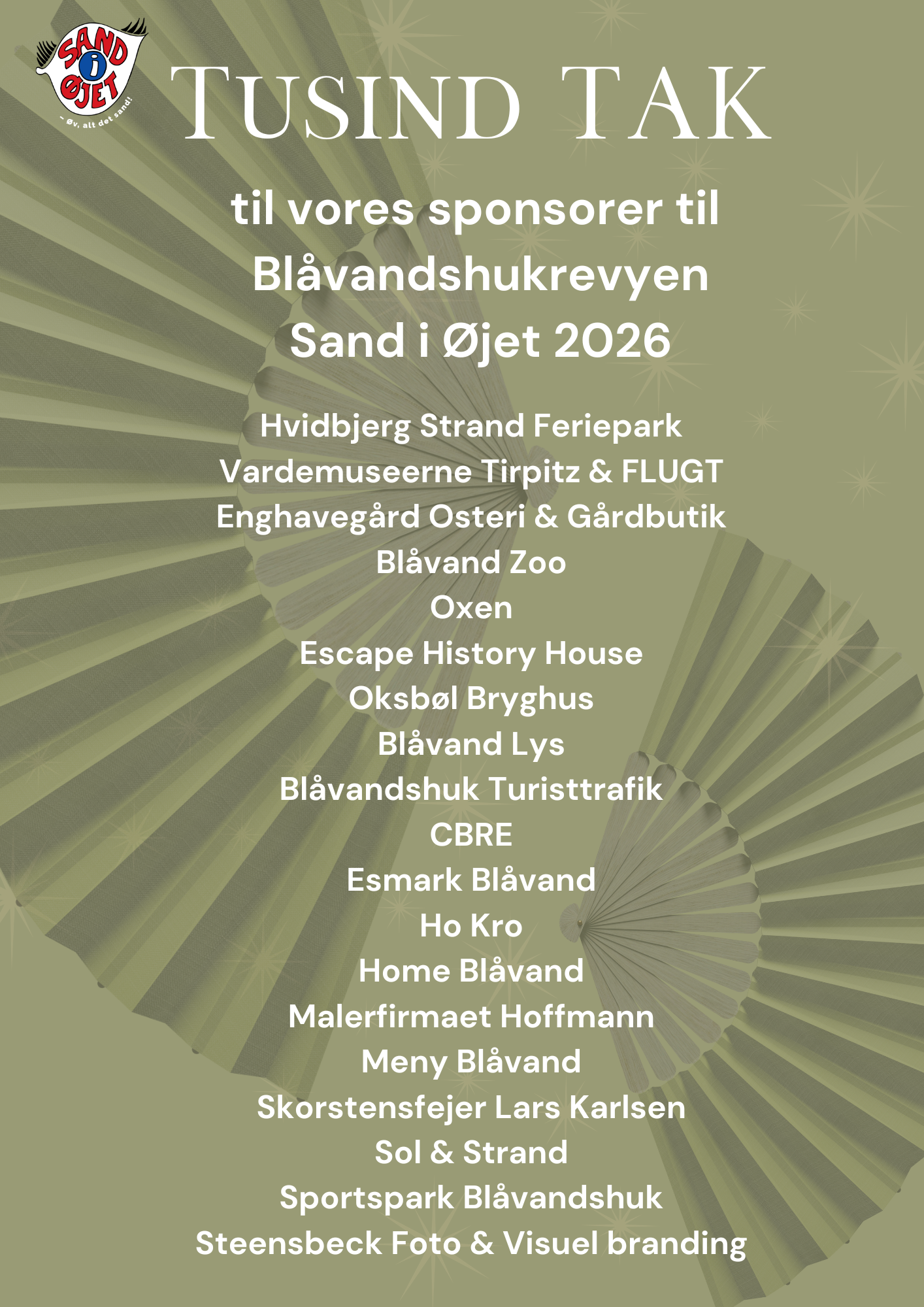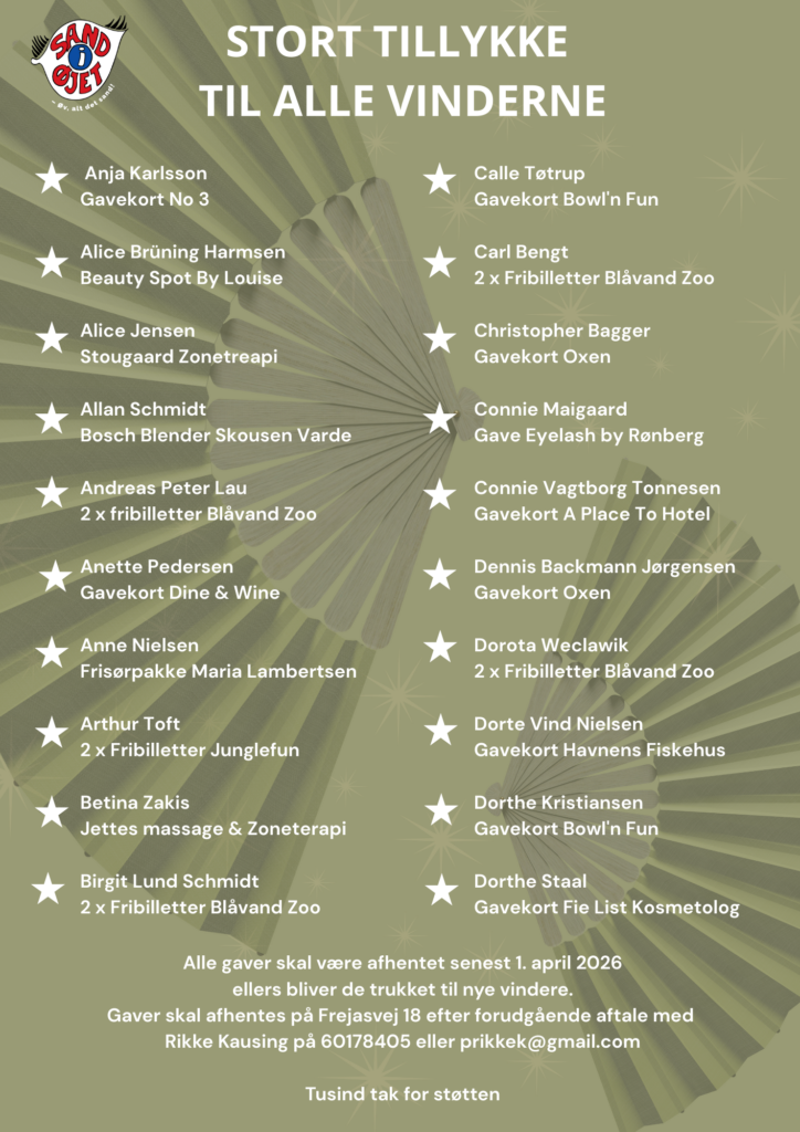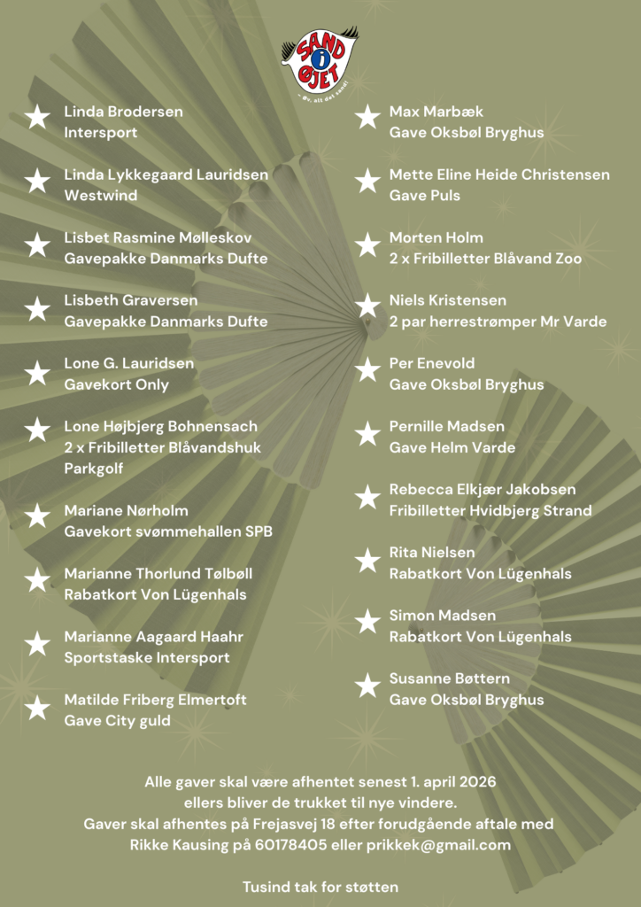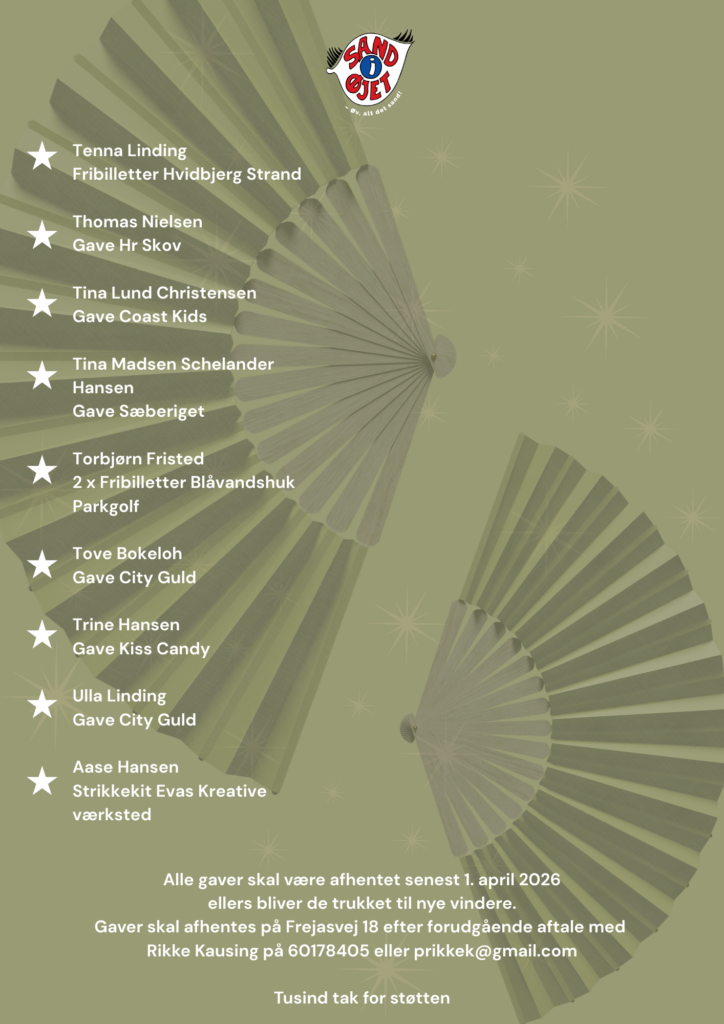 Gevinster trækkes 13. februar 2025. Vinderen får direkte besked og offentliggøres derefter på www.sandiøjet.dk og vores Facebook side Blåvandshukrevyen Sand i Øjet